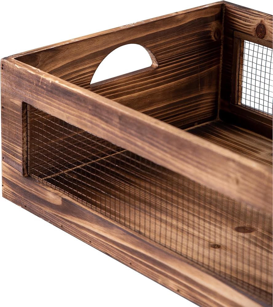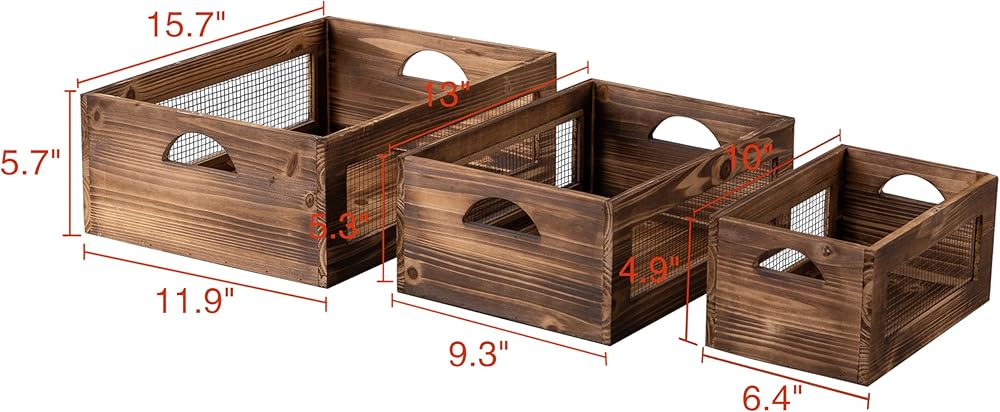 [DIMENSIONS] We offer wooden crates in 3 different sizes. Set of 3 farmhouse wood crates for storage. Large Crate: 14” x 10” x 6”, Medium Crate: 12.6” x 8.7” x 5”, Small Crate: 10.2” x 7.3” x 4.3”.