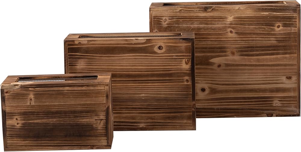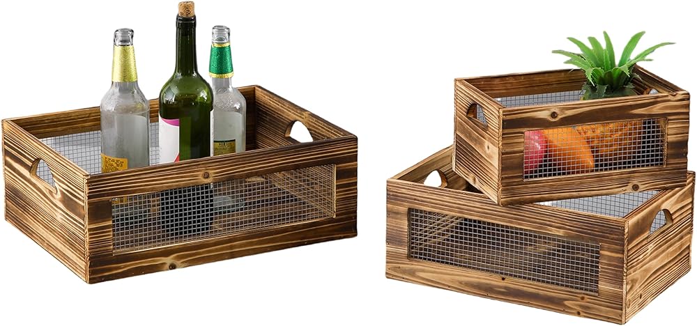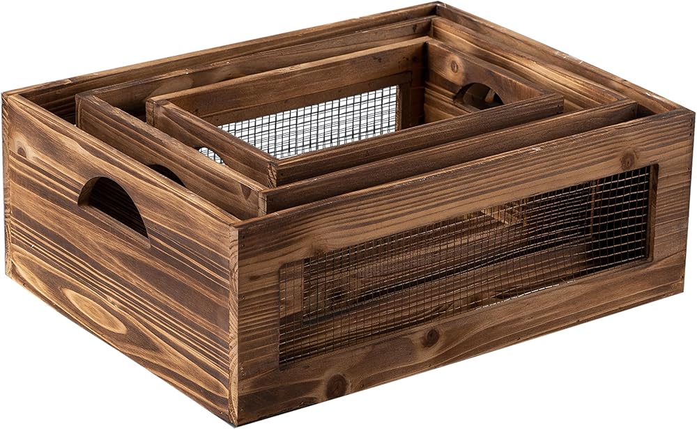 [HANDMADE MULTI-FUNCTIONAL CONTAINERS] Made of sturdy wood. These nesting crates are stackable and nest into one another for easy storage. The cutout handles make them easy to carry around. Space saving design will help you create an extra space storage solution in your home. Each piece is unique and may have a small variation on the finishing.