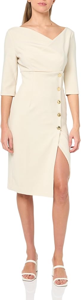 Try out the Edeline Sheath Dress with draped neckline from Black Halo. Faux covered buttons and a slit at the front complete this midi silhouette.