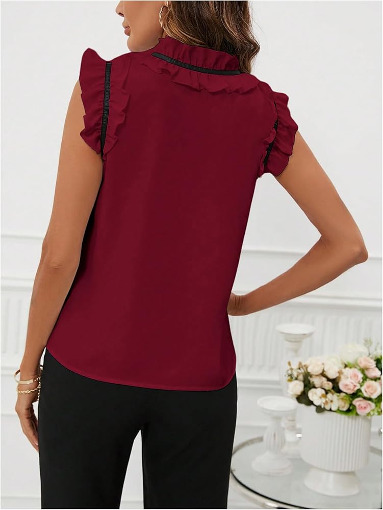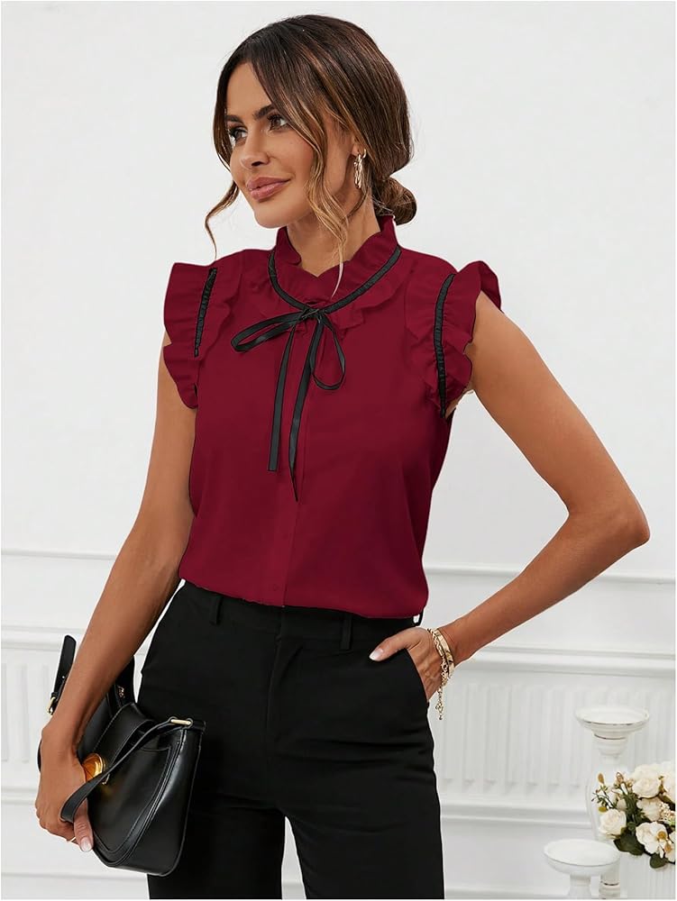 - Feature: Bow front, ruffle trim, mock neck, flounce cap sleeve, button front, blouse top, smooth to skin
