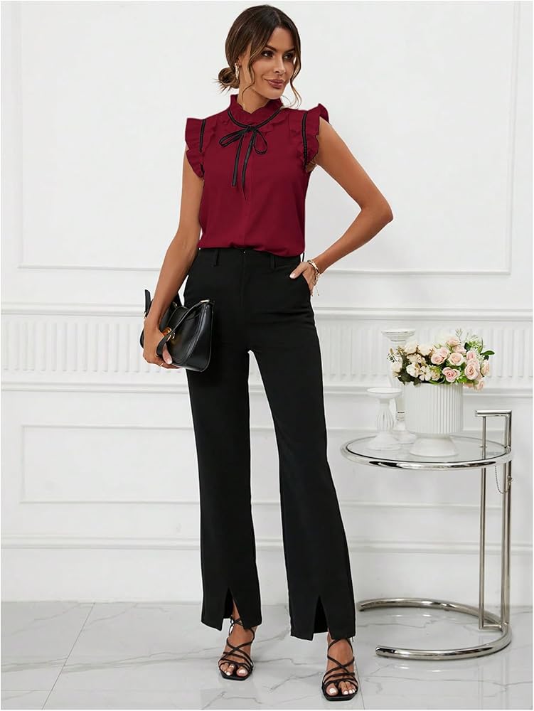 Women's Work Office Blouse Elegant Bow Tie Neck Ruffle Trim Vintage Blouse Business Casual Shirt Top