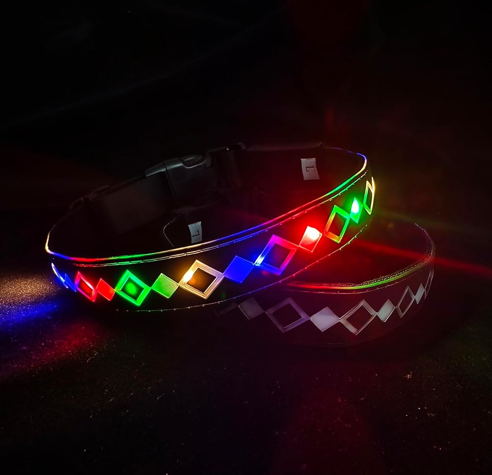 This CC SIMON Night Light Up Dog Collar is a great way to keep your dog safe and visible at night. It features a multi-color running LED light that is super bright and rechargeable, making it easy to use and convenient. The collar is adjustable to fit dogs of all sizes, and it is made from high-quality materials that are durable and comfortable. The LED light is also animatronic, with seven different flashing modes, so your dog will look like a star in the dark. The collar is perfect for walking, running, or hiking with your dog, and it will help you keep them safe and visible in low-light conditions.