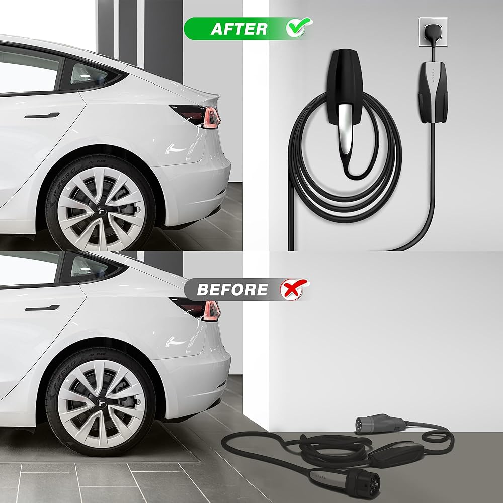 *KEEP YOUR GARAGE NEAT AND SECURE - A convenient wall-mount holder keeps charging plug clean and tidy and reduces risk of tripping. The charger head fits tightly into socket to ensure the charging plug remains firmly in place, preventing accidental disconnections