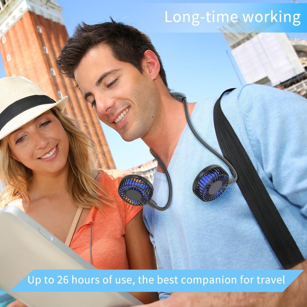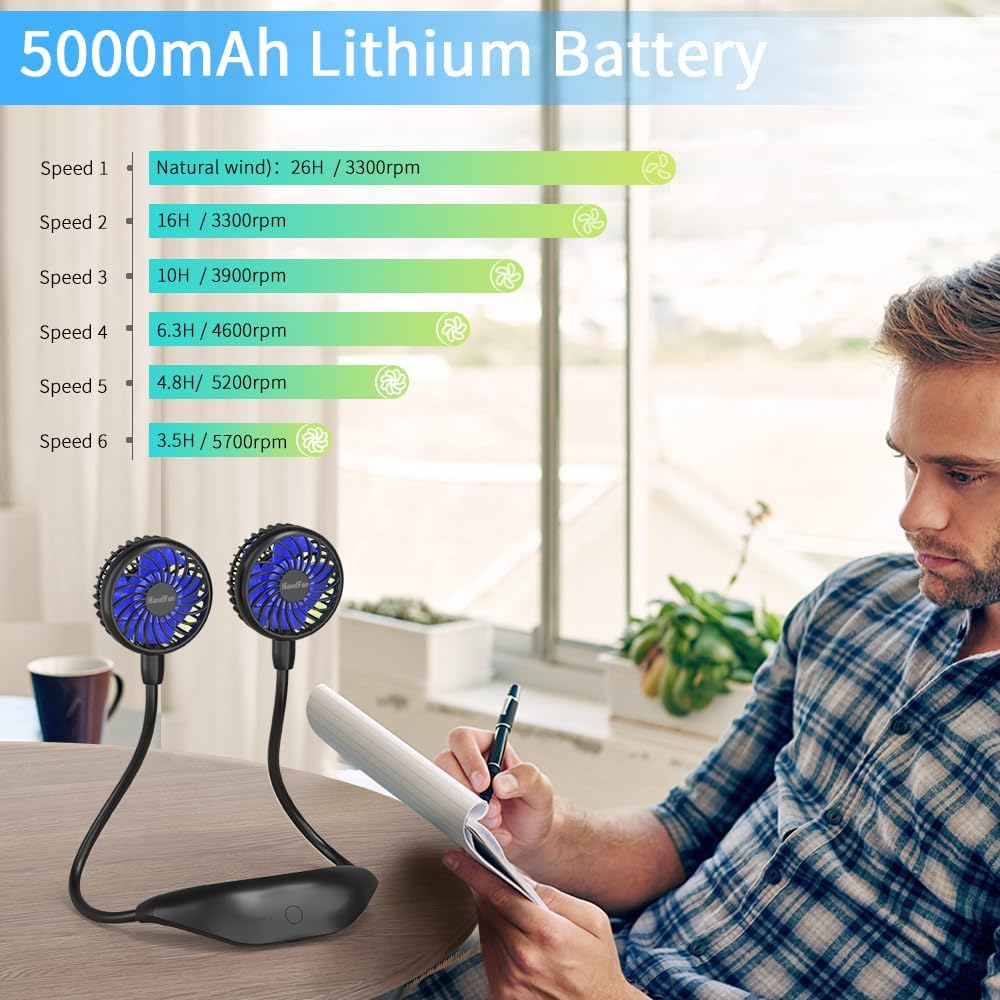 48H Long Lasted: Built-in 10000mAh rechargeable battery, this neck fan can run 6-48Hrs depend on the speeds. so you won't worry about power off outside and almost use it all day.