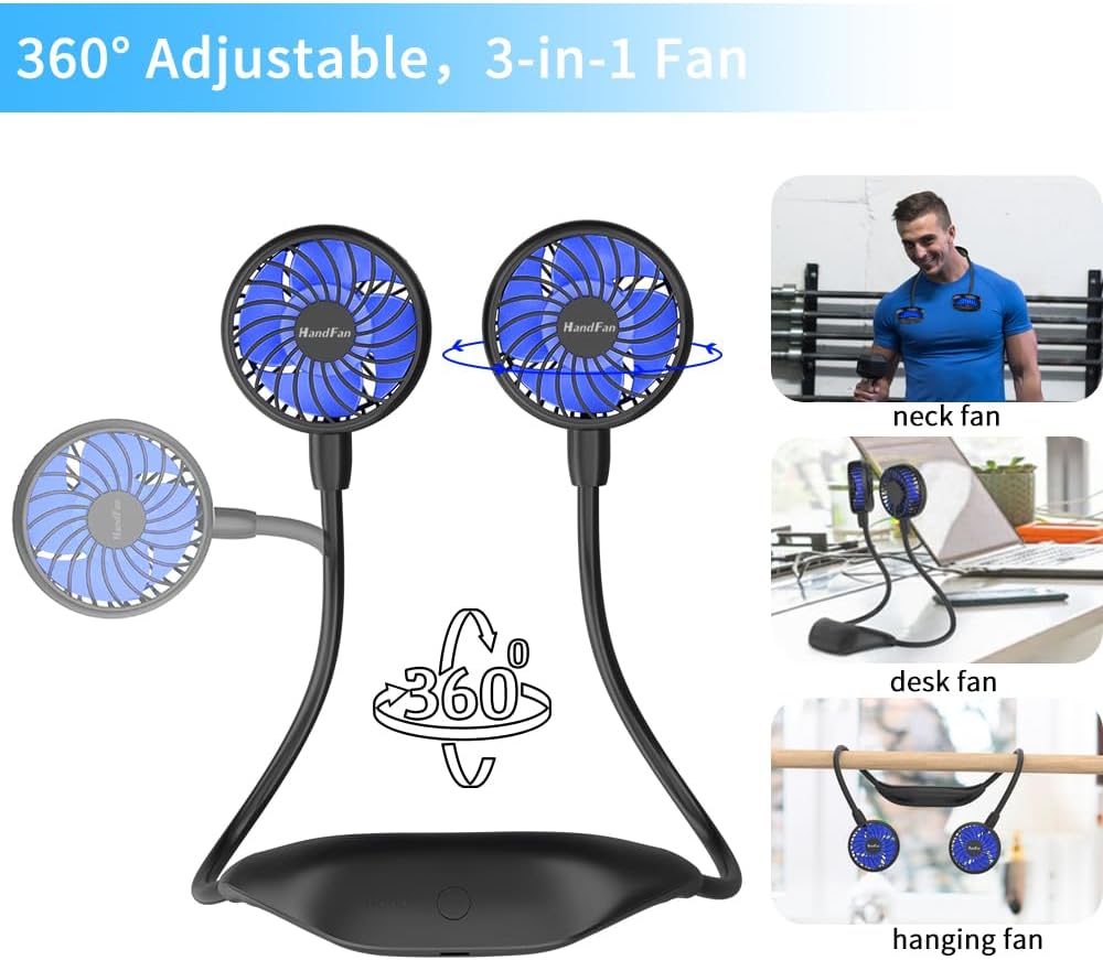 2 IN 1 Neck & Desk Fan: Adjustable gooseneck design makes it can stand on the table, also the fan head can be adjusted from 0°-360°, so it can be used as a desk fan and cool you off anywhere.