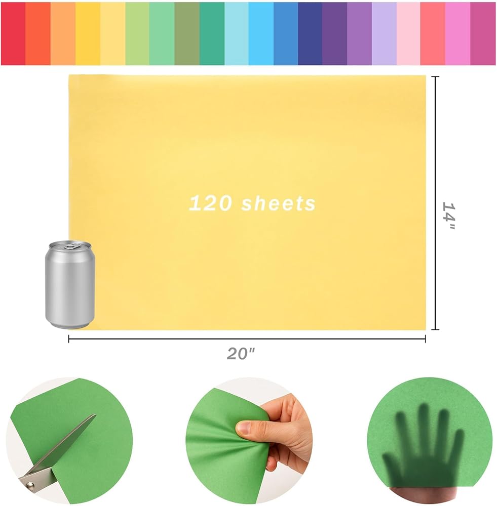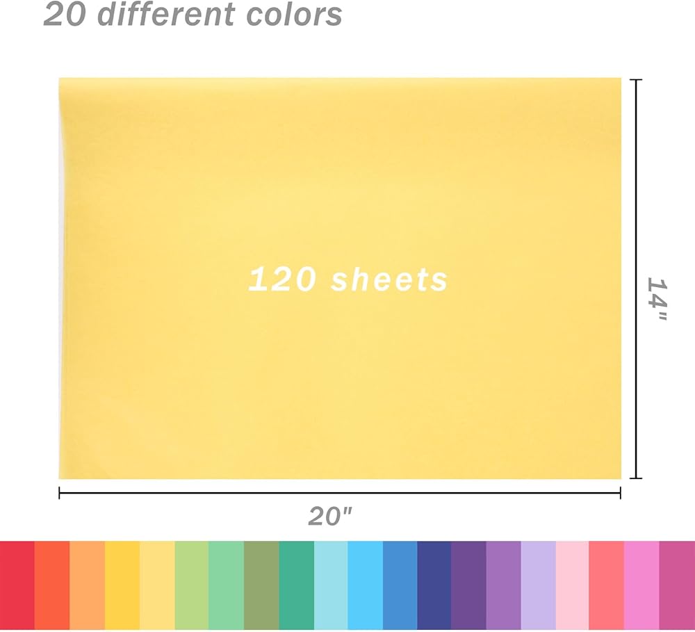 Super Value Pack - 120 sheets of tissue paper, each measuring approximately 20" x 14" (50cm x 35cm), with a thickness of 14GSM, 20 different colors included.
