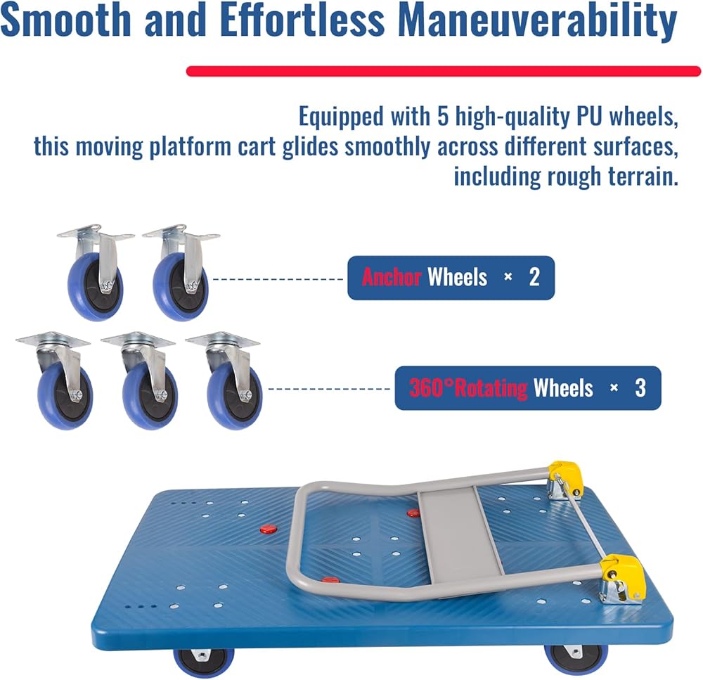【Durability and Longevity】Crafted with a heavy-duty frame, the platform hand truck is built to last. Its sturdy construction ensures reliable performance over time, even when subjected to rigorous use or rough handling, making it a durable investment for any workload.
