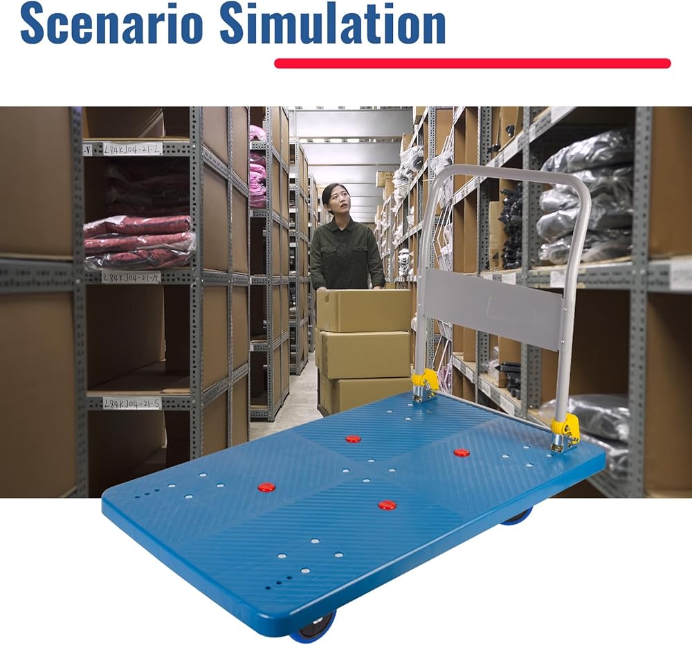 【Versatile and Convenient】With its generous platform size of around 43.3" x 25.6", the platform truck provides ample space for various tasks around the home, garden, warehouse, garage, or workshops. Its versatility ensures it's not limited to just one type of job, making it a valuable tool for numerous applications.