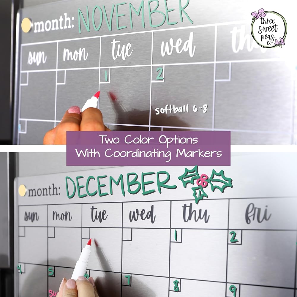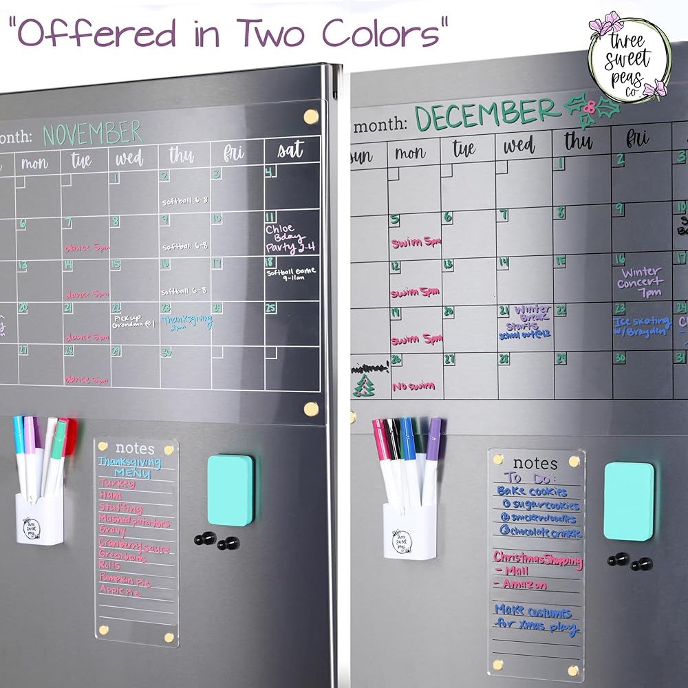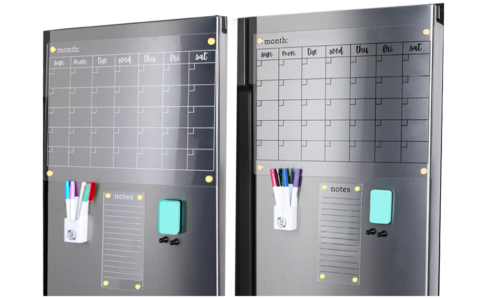 Black or White Options - Our acrylic fridge calendar comes in two variations: white print calendar with light markers for stainless or black fridges, and black print calendar with darker markers for white fridges.