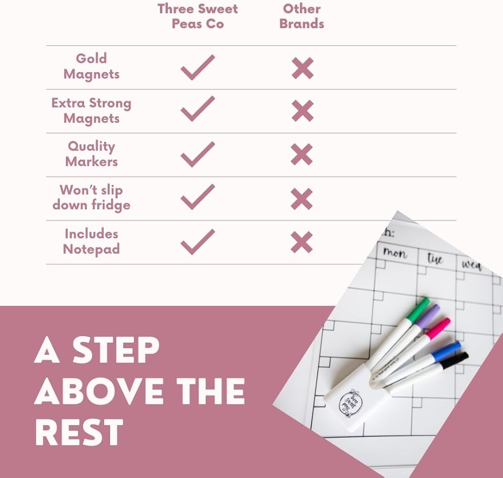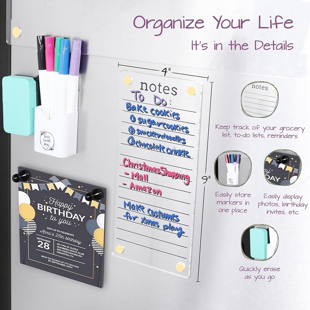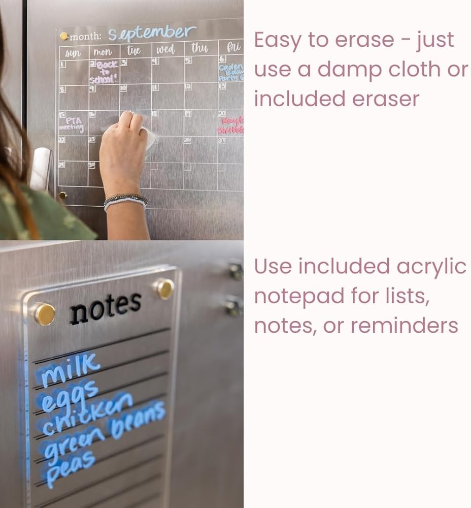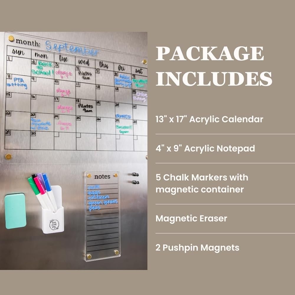 Everything You Need - Our magnetic acrylic calendar for fridge includes a magnetic marker holder, eraser, 2 magnets, and a 4x9 acrylic notepad. High-quality brush tip chalk markers are included - no shaking or pressing required. Write, erase, and keep things organized effortlessly