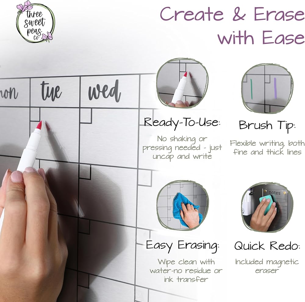 Write with Ease - The brush tip of our chalk markers lets you create fine or thick lines that stay put but are easy to erase with water or the included eraser. Enjoy a long-lasting, mess-free planning experience with our clear fridge calendar