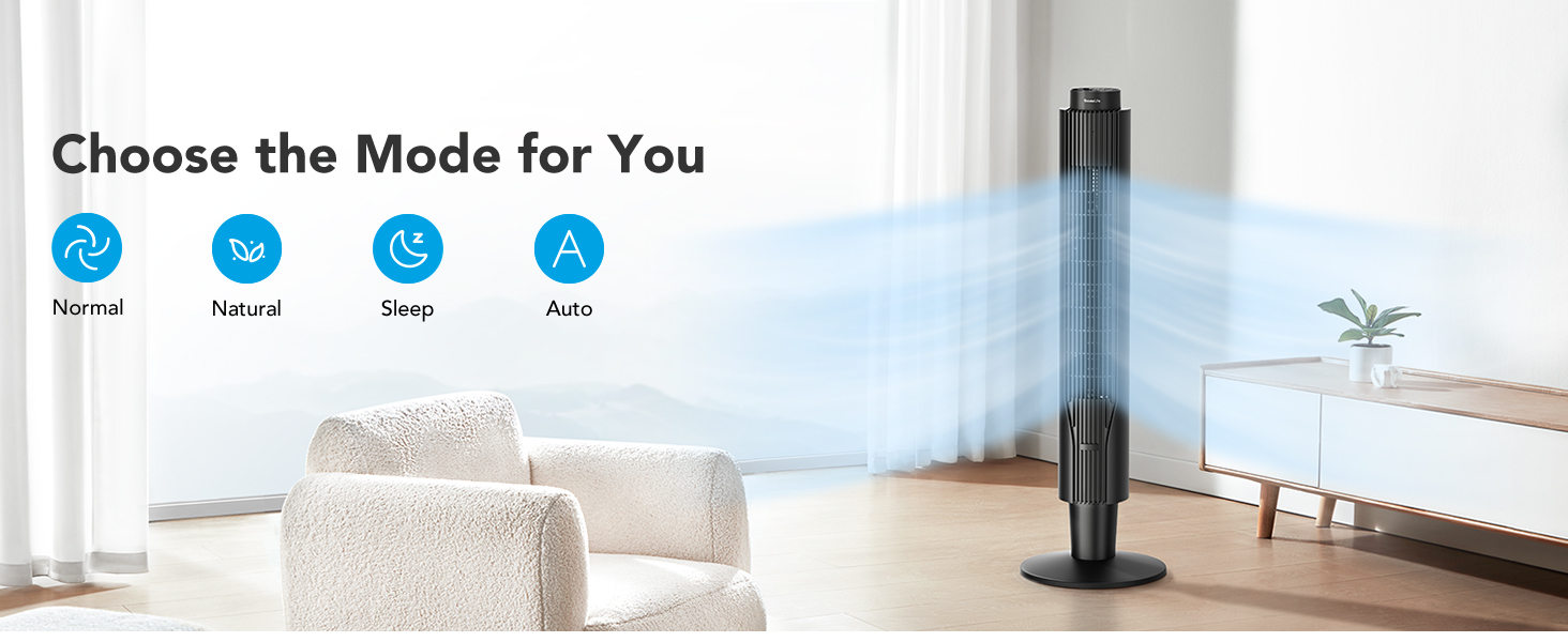 Efficient Customized Cooling: Featuring 4 modes (normal, natural, sleep, auto), 8 speeds, 25ft/s wind speed and a 80-degree wide airflow coverage, this powerful bladeless tower fan makes it easy for you to stay cool during the sweltering summer or drift off into a breezy slumber.
