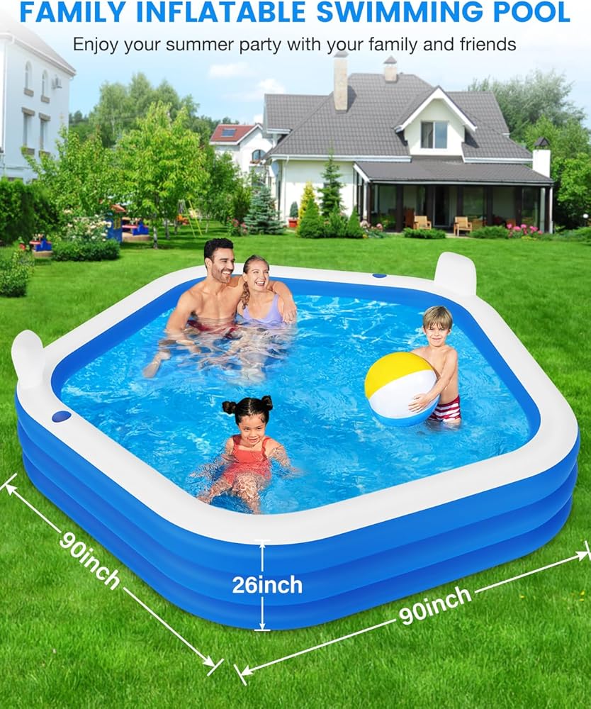 Inflatable Swimming Pool with Pump, 90" X 90" X 26" Kiddie Pool with Seats and Headrests, Oversized Thickened Blow-Up Pool for Kids, Adults, Family, Pools for Outdoor, Backyard, Indoor