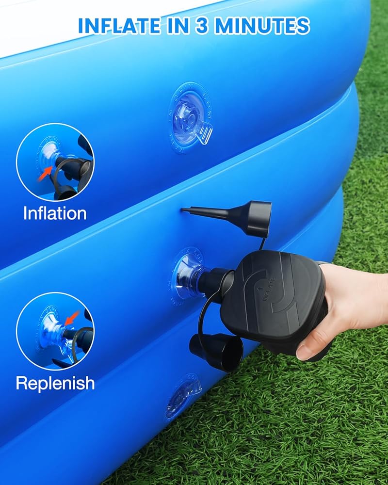 Easy Set-Up: Come with an electric pump, and can set up the pool in 3 minutes. Design with a three-ring independent air chamber and 2 air valves, faster inflation, and deflation. The powerful pump also can help deflate. Built-in 90° drain pipe, easy to drain