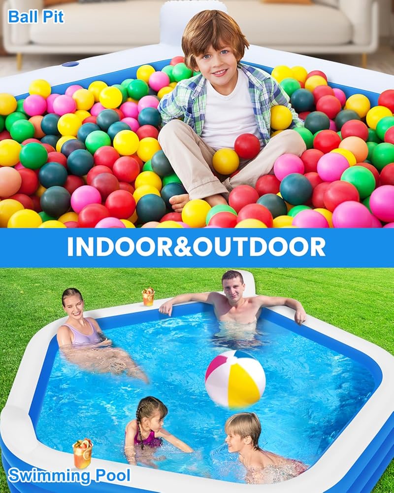 Swimming Pool with Seats: Designed with two cushions and two pillows. Cozy up in the blow-up pool, put a drink in the cup holder, and play with the family! Not only a kiddle pool but also a family playground.