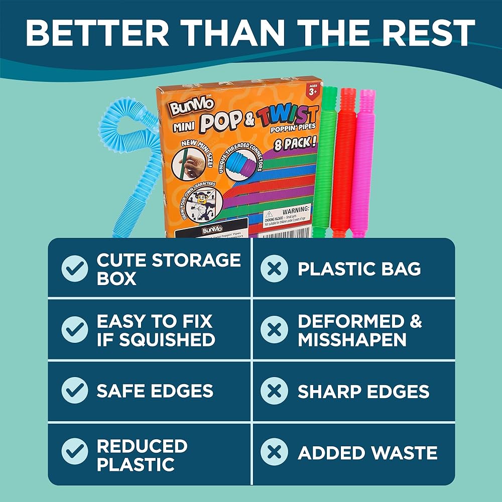 Premium Quality - BunMo is the leading brand in sensory toys, and our Mini Pop Tubes are made with high-quality, durable, BPA-free plastic that won't crack. If squished, they can be easily fixed using a pen, knitting needle, or chopstick.