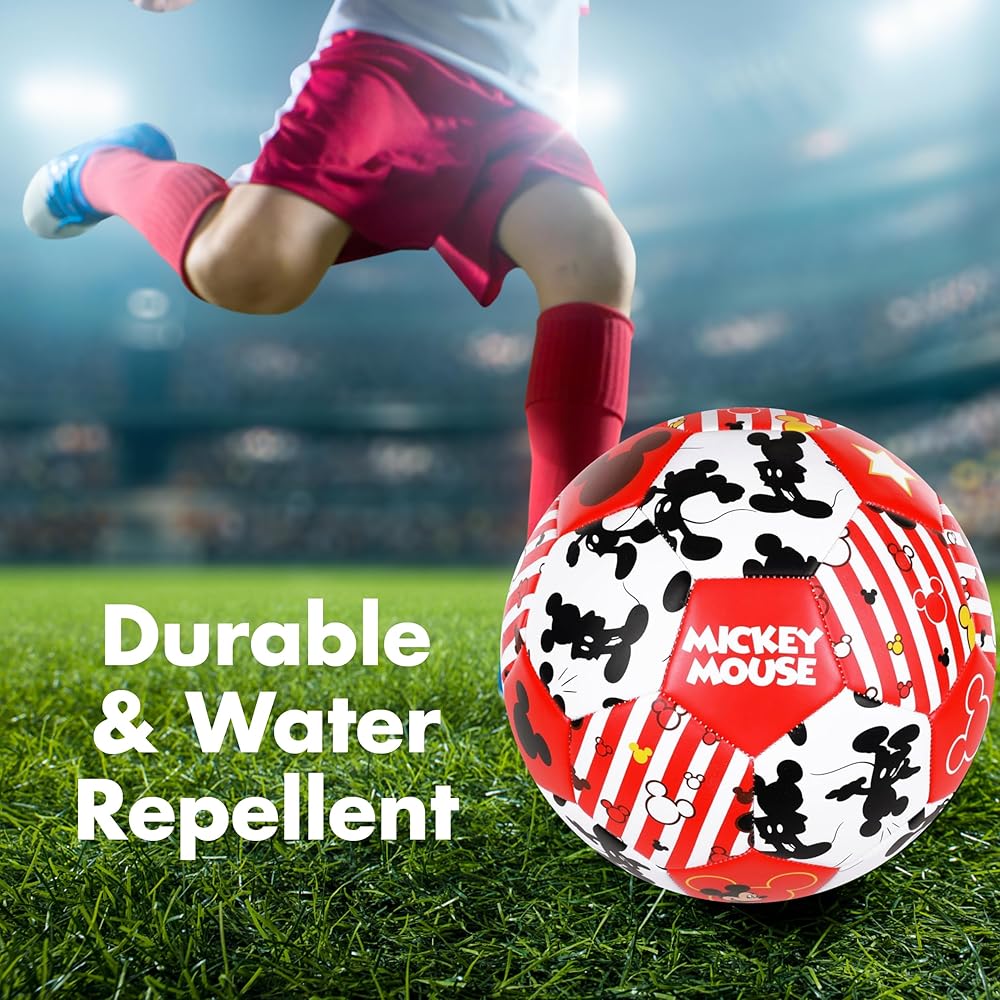 Get your kids ready for soccer season and give the perfect gift to the Disney fan in your life with this I Heart Mickey soccer ball. Measuring approximately 8 inch in diameter, these children's soccer balls are excellent for practicing, dribbling, kicking, shooting, and other valuable soccer skills so that your child is ready for game day. Perfect for boys and girls ages 13 and up, these sport training soccer balls feature a strong and sturdy water repellent PVC shell with machine-stitched technology for long-lasting reliability and better movement on grass fields, yet still provide a soft touch ideal for young kids. Each kids soccer ball features an inner rubber bladder for optimal air retention and a durable shape to keep your ball properly inflated for outdoor use. These sports equipment and soccer accessories are officially licensed Disney products.