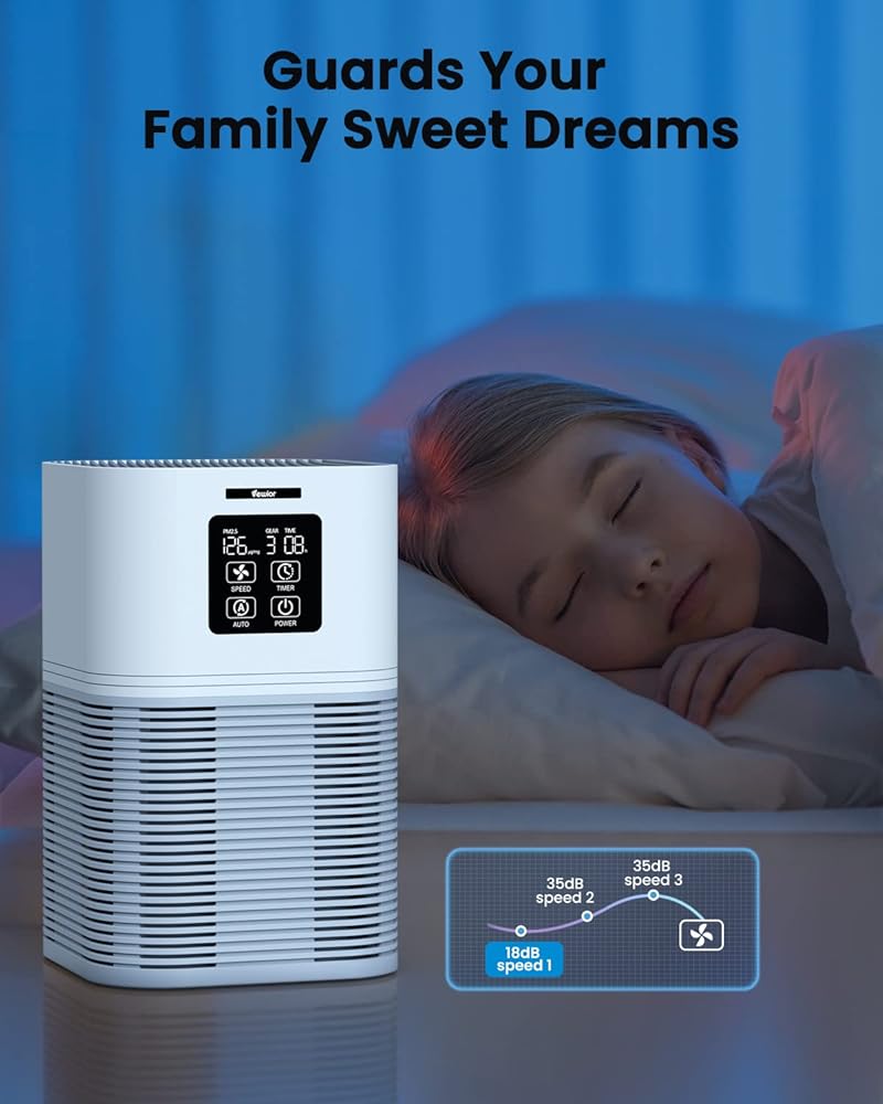 Ultra-Quiet & 3 Fan Speeds: H13 true HEPA air purifier runs at low speed and low noise to ensure that your sleep or reading is not disturbed. The minimum noise level is 18 dB on the lowest setting. The fan speed can be selected accordingly. The portable air cleaner has three fan speeds. The higher the fan speed, the greater the cleaning effect.