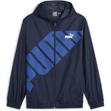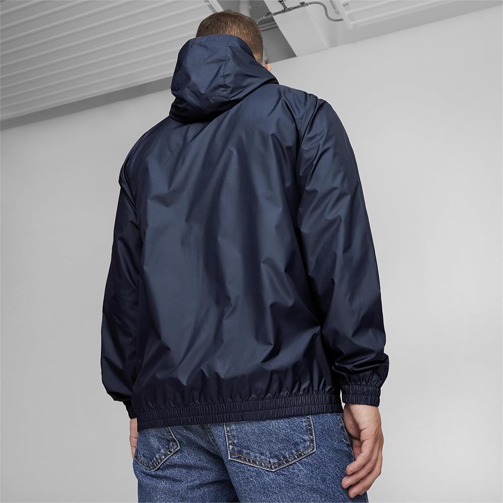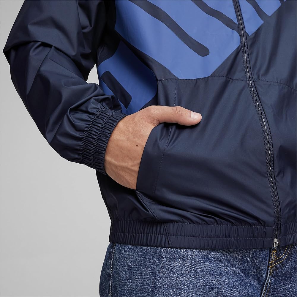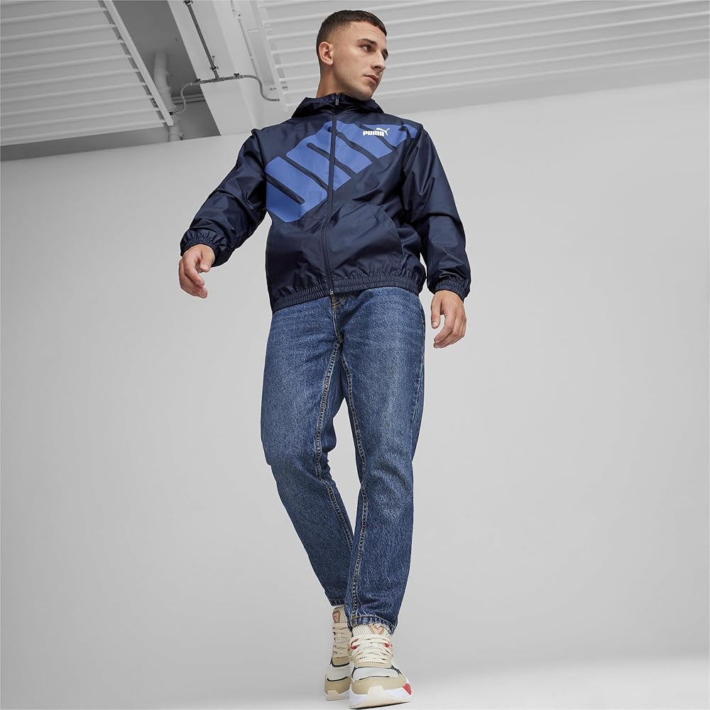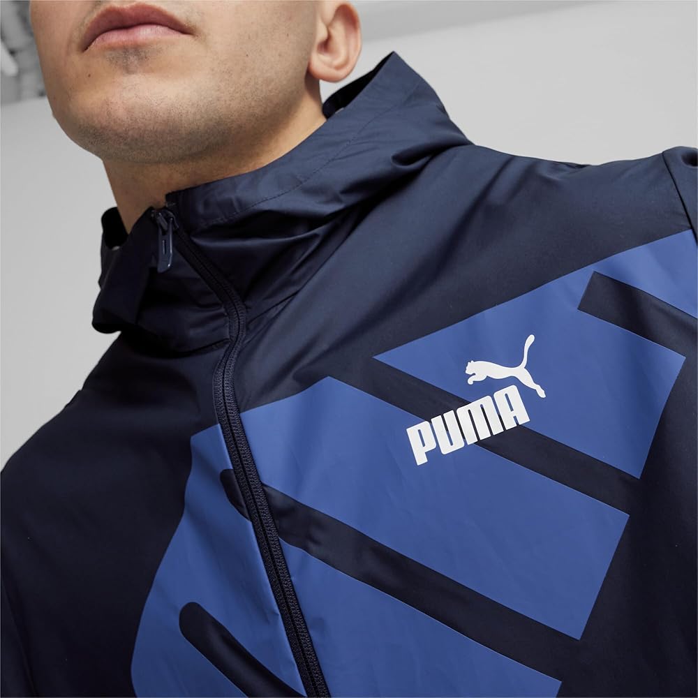 This PUMA graphic windbreaker features a bold front logo with a full front zipper and a hood, it is light weight and stylish, keeps you warm and looking good in cool weather.