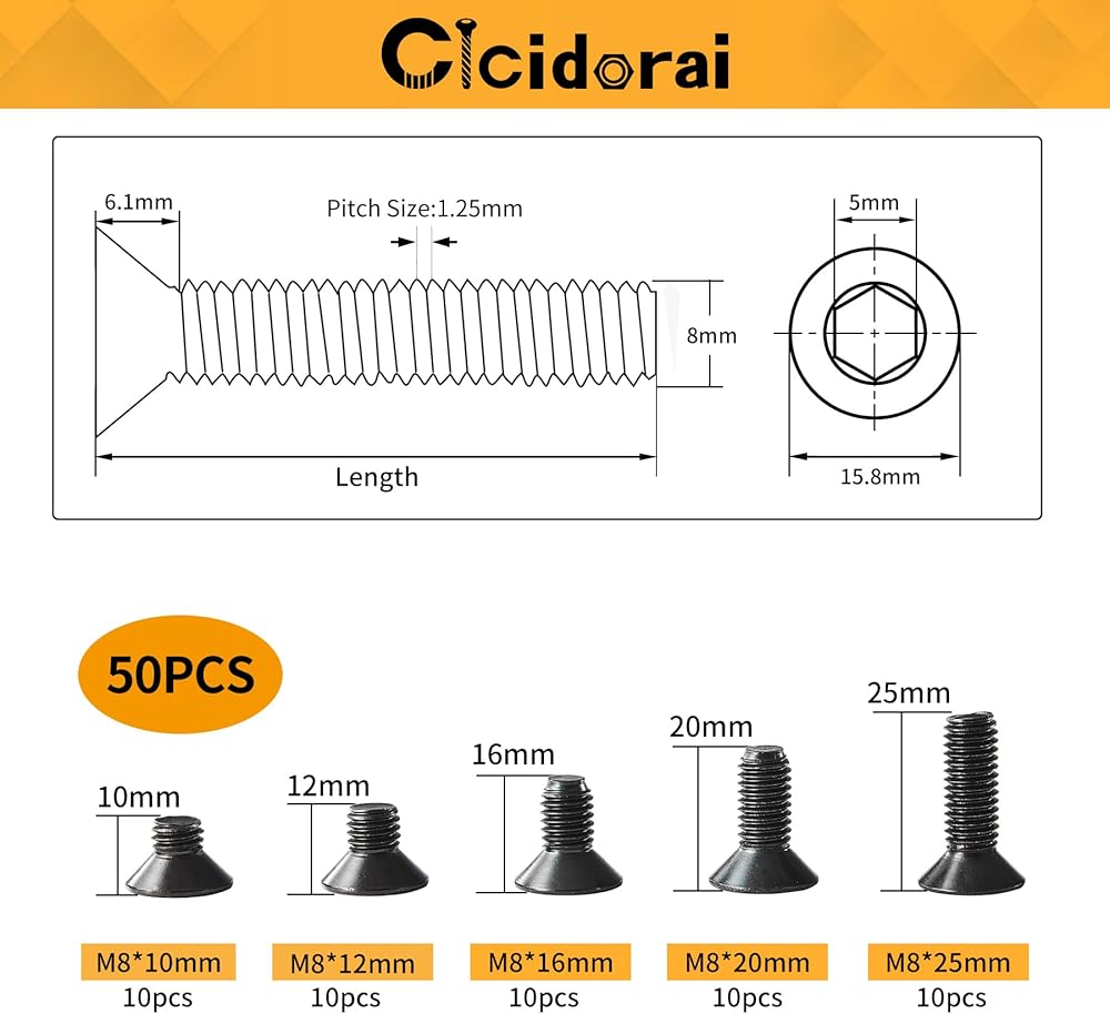 Package Included: M8 x 10mm(10PCS), M8 x 12mm(10PCS), M8 x 16mm(10PCS), M8 x 20mm(10PCS), M8 x 25mm(10PCS); Total: 50PCS.