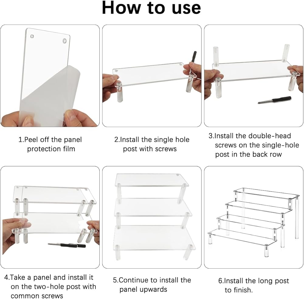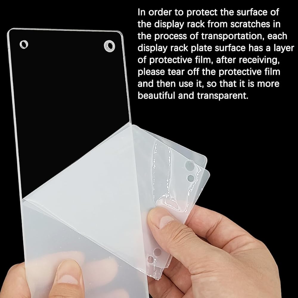 CAVEAT: In order to protect the surface of the display rack from scratches in the process of transportation, each display rack plate surface has a layer of protective film, after receiving, please tear off the protective film and then use it, so that it is more beautiful and transparent. If you are not satisfied with the product or there is any issue with the product, please contact with us and we will solve it for you.