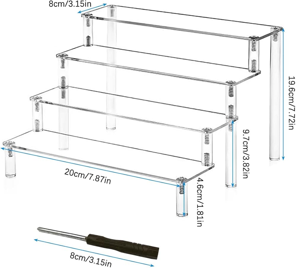 DISPLAY STAND SIZE: 4 layers in total, each layer is 20 cm / 7.87 inch long and 8 cm / 3.14 inch wide. Each layer is 5 cm / 2 inch high. Suitable for most delicate small items to be placed.