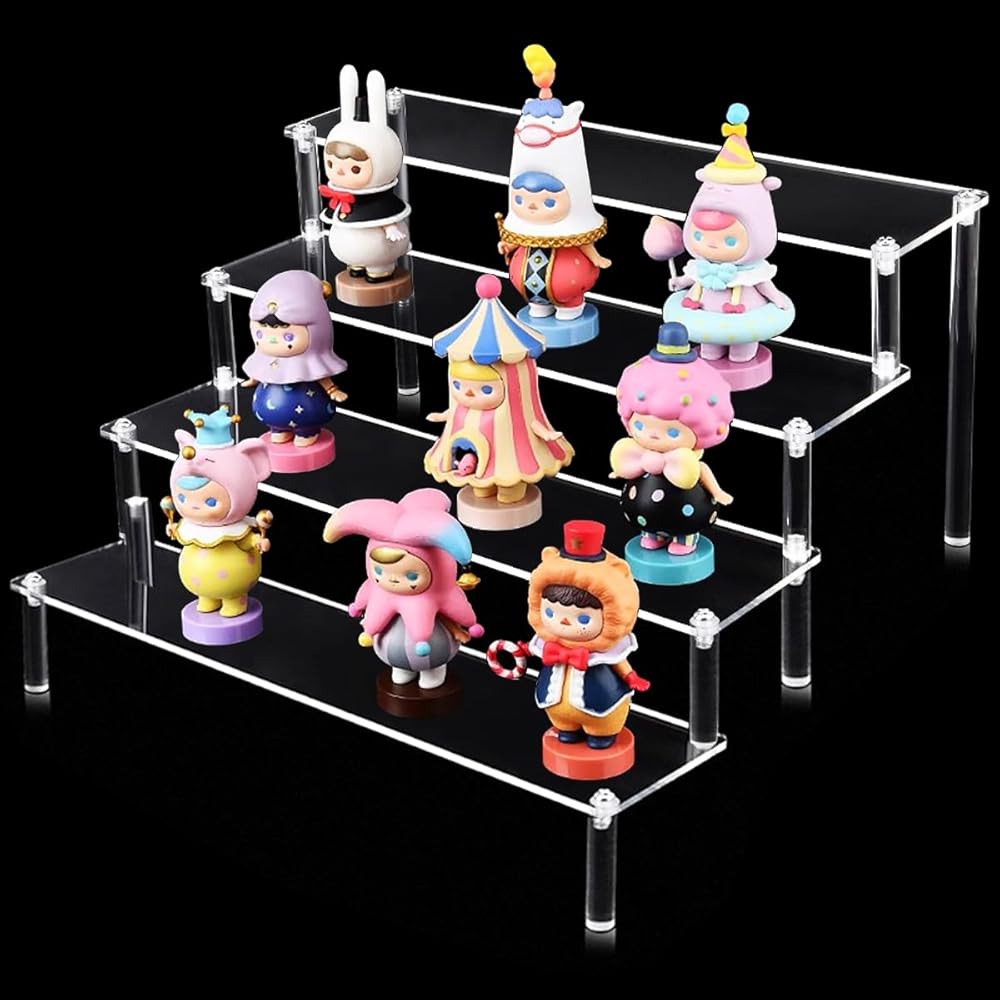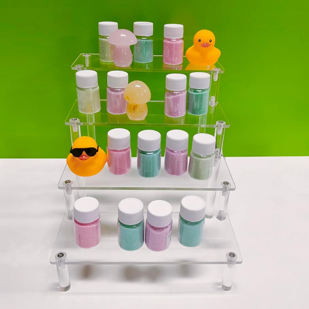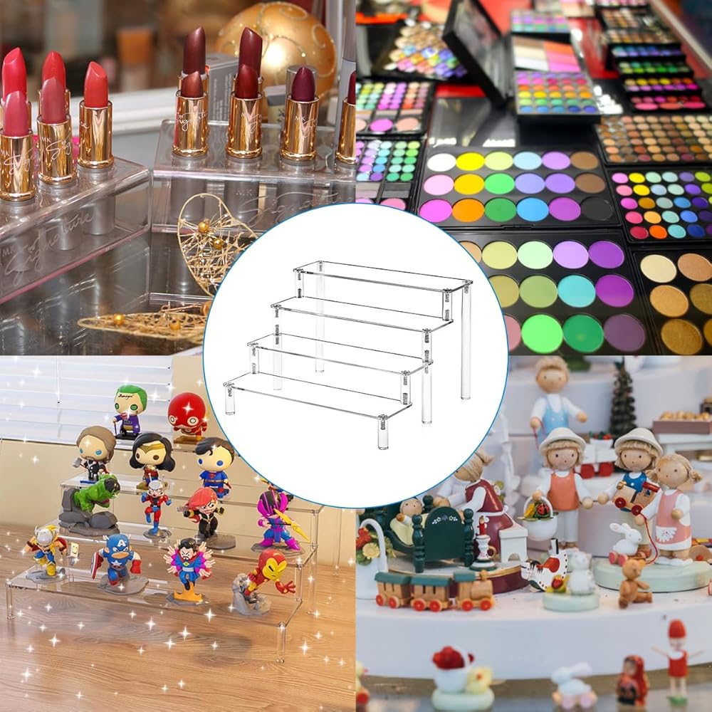 WIDE RANGE OF APPLICATIONS: This display rack has a wide range of applications, you can use it to hold cosmetics, perfumes, dolls, artifacts, lipsticks, small cupcakes for parties and more! Sure you'll love the clear shelves!