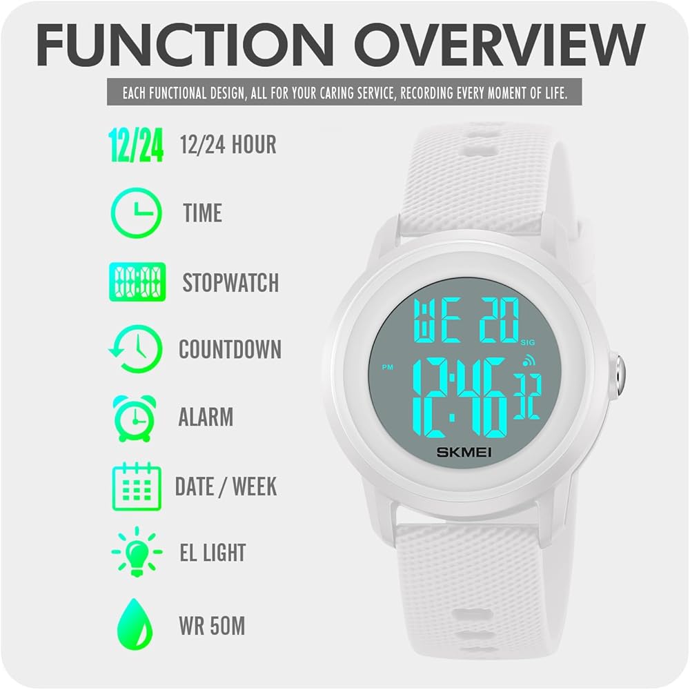 Classic Digital Watch for Men/Women: This watch features a minimalist design with an LED display screen and multiple functions including dual time, stopwatch, countdown, date, day, week, daily alarm, luminous display, and 12/24 hour format. The EL backlight makes it easy to read the time at night.