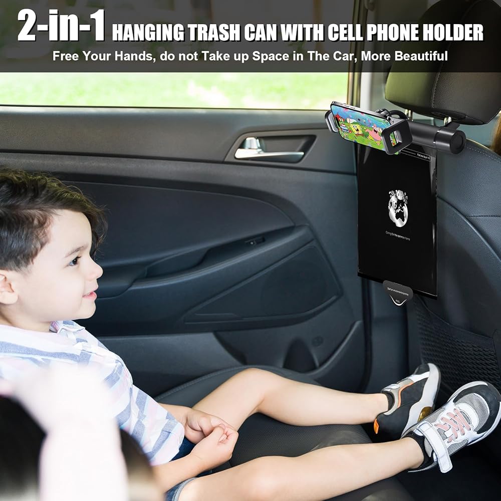Unique Upgraded Design: The two-in-one multifunctional hanging storage trash can combines a round metal roller and a phone holder, seamlessly matching your car interior while safeguarding your vehicle.