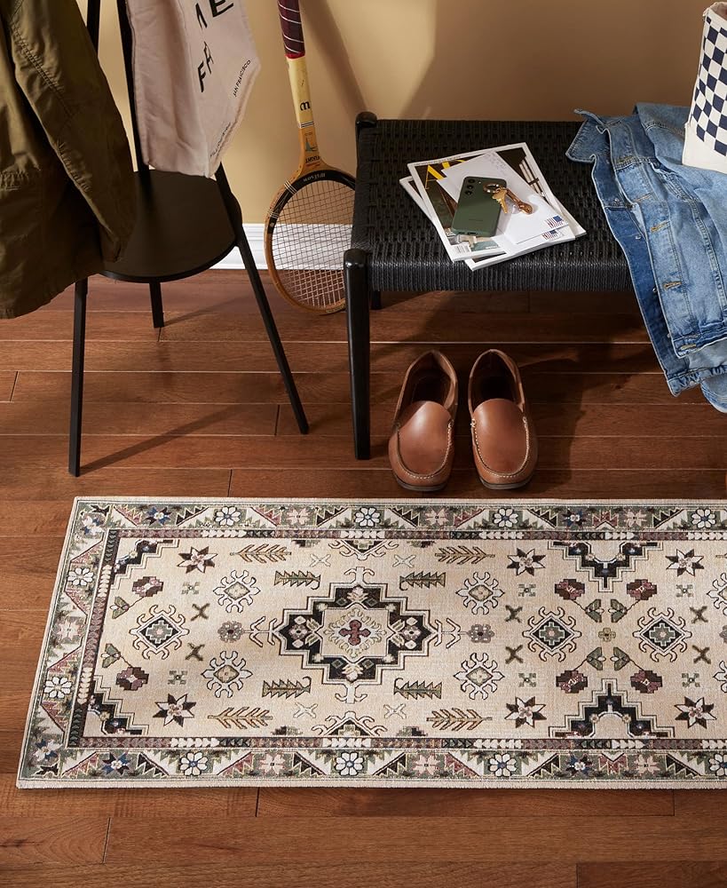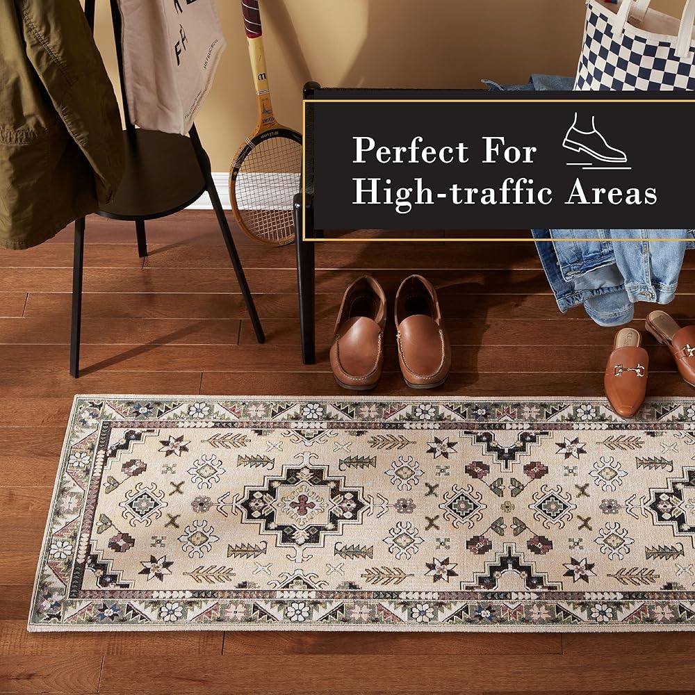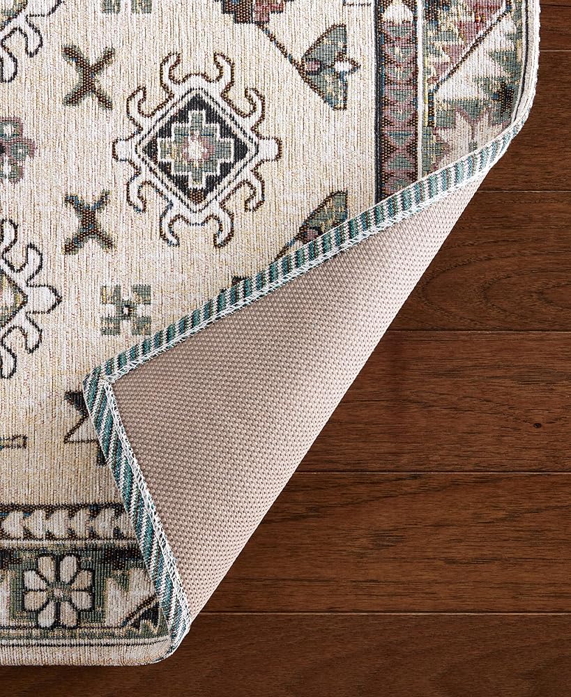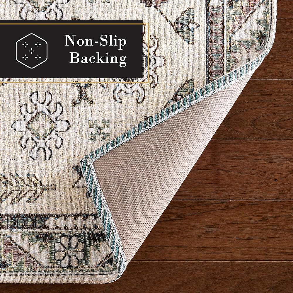 The Livie Everwash™ Machine Washable Multi-Use Decorative Rug is a perfect addition to your home. Use as a kitchen rug, low-profile door mat, in a hallway, or as a bedroom rug to instantly update your space. This decorative rug is expertly crafted from a blend of 90% Jacquard Woven Polyester and 10% Cotton, ensuring both durability for high-traffic areas and a touch of luxurious softness. This machine washable rug, complete with a non-slip latex backing, seamlessly combines versatility and style, making it the perfect multi-purpose mat for adding sophistication to any room in your home.
