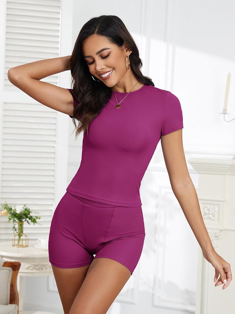 Fashion design: slim fit, short sleeves, round neck design, elastic high waist, elastic shorts. This women two piece outfits sets has a stylish threaded texture that provides comfort and style.
