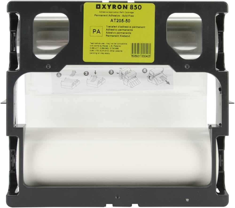 Acid-free refill cartridge is 50-feet long and fits into a Xyron 850 machine. Laminates one side and applies an even layer of edge-to-edge adhesive on the other. The 850 by Xyron works with out batteries, heat or electricity, so it is quick and easy to use. Other refill cartridges available include dual lamination, permanent adhesive and acid-free repositionable adhesive.