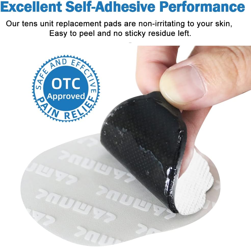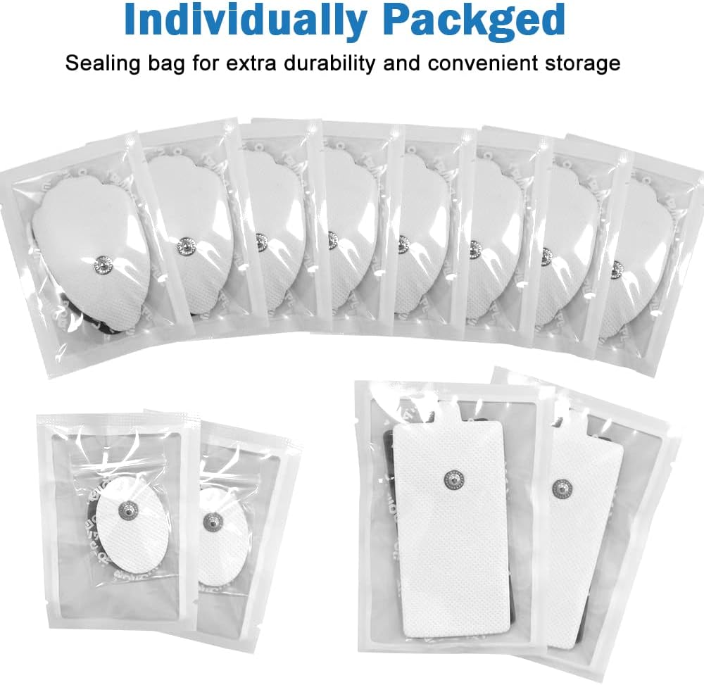 Our tens unit replacement pads stay on and are easy to take off with no sticky residue left behind ,More repeated use without diminished effectiveness. the individually bagged for convenience of storage and use.