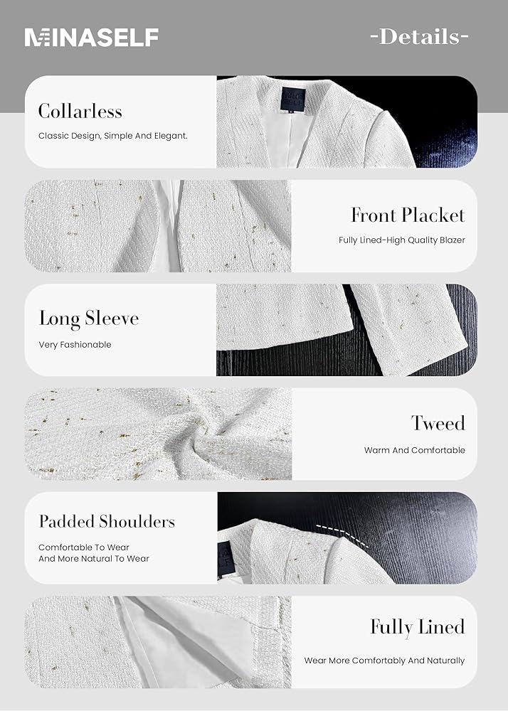 This tweed jacket women is of good quality and product sizes are all standard American sizes, please choose according to your daily size,Mina Self has many high quality products, welcome to enter the store to choose.|To provide you with a careful after-sales service