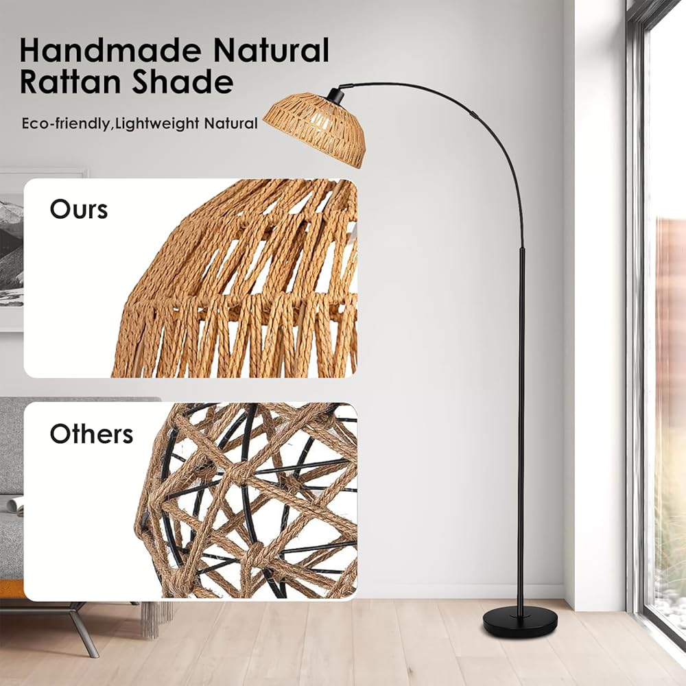 Easy Assembly & Premium Rattan: Releasing your hands.Our floors lamp is very convenient to install.Manual introduces the installation steps clearly ,All you need to do is to screw all the parts of lamppole together following the instruction, quickly finished within minutes Equipped with 9W led bulb for this floor lamp for living room,you don't need to have another shop trip,Our rattan floor lamp will bring a boho atmosphere to your room and beauty to your space