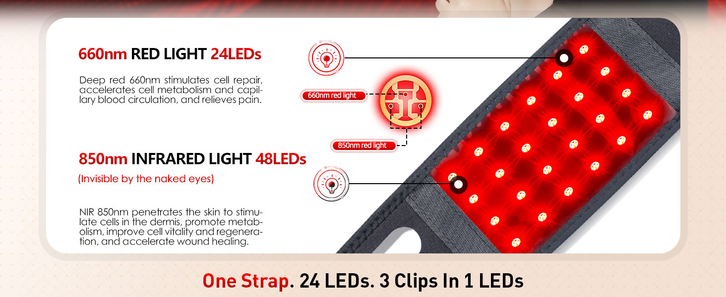 🎭[Professional Infrared Red Light Therapy Chin Strap] - 24pcs 660nm wavelengths red lights and 48pcs 850nm wavelengths near-infrared lights combo LED light therapy belt. As we all know, 660nm-red light is readily absorbed by surface tissues and cells to improve skin issues; 850nm-near infrared (NIR) light is invisible which penetrates into deeper tissues to enhanced recovery and aids in muscle performance and joint stiffness.