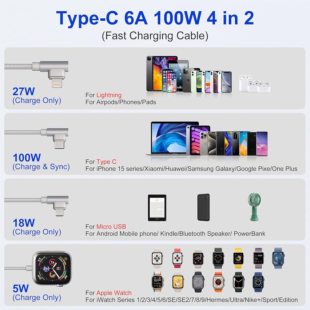 100W USB C Fast Charge Multi Charging Cable for Apple Watch and iPhone 15-90 Degree 4 in 2 USB C/A Travel Watch & Phone Charger Cable for All iWatch iPhone MacBook i-Pad and Other Type-C Devices