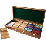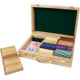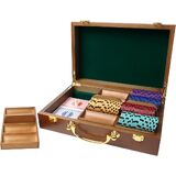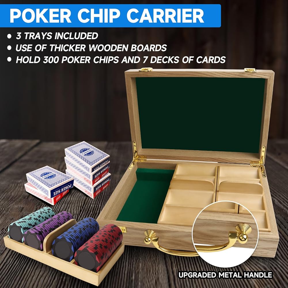 CAPACITY: The closed dimensions of our poker chip carrying case are 12.5"L x 8.5"W x 3.5"H. The chip case has three wooden trays that hold 300 poker chips totally (100 per tray). The chip case set features a storage area for 7 decks of cards.