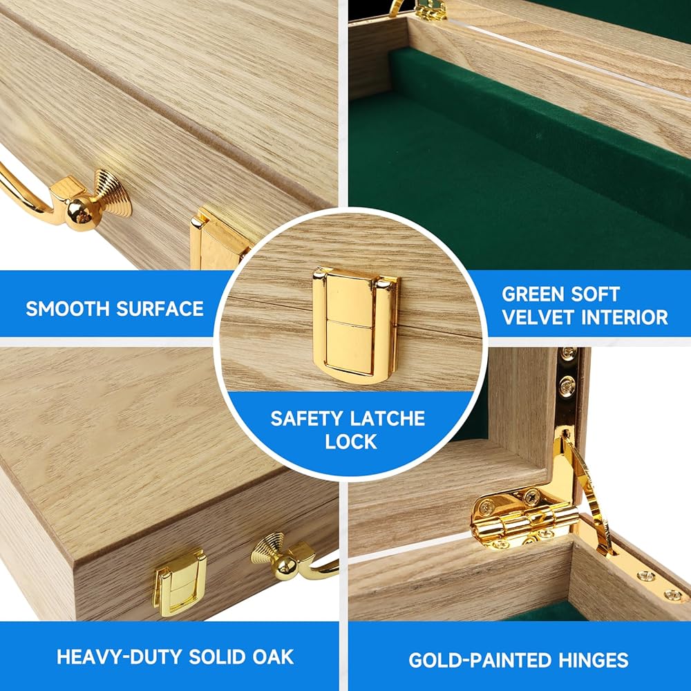 EASY TO CARRY & STORE: The inside of the case is lined with a green velvet interior that will cushion the chip trays as well as giving the case a classic look. The case comes with gold-painted hinges and latches to ensure the opening and closing of the case is as smooth as possible while still looking great.