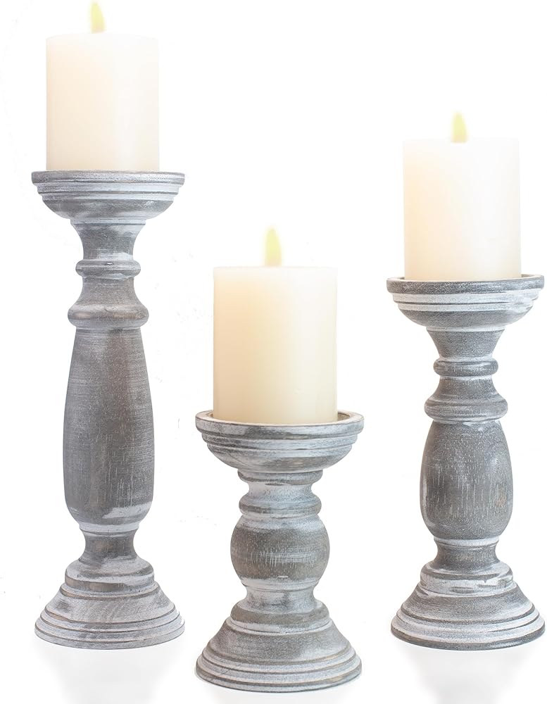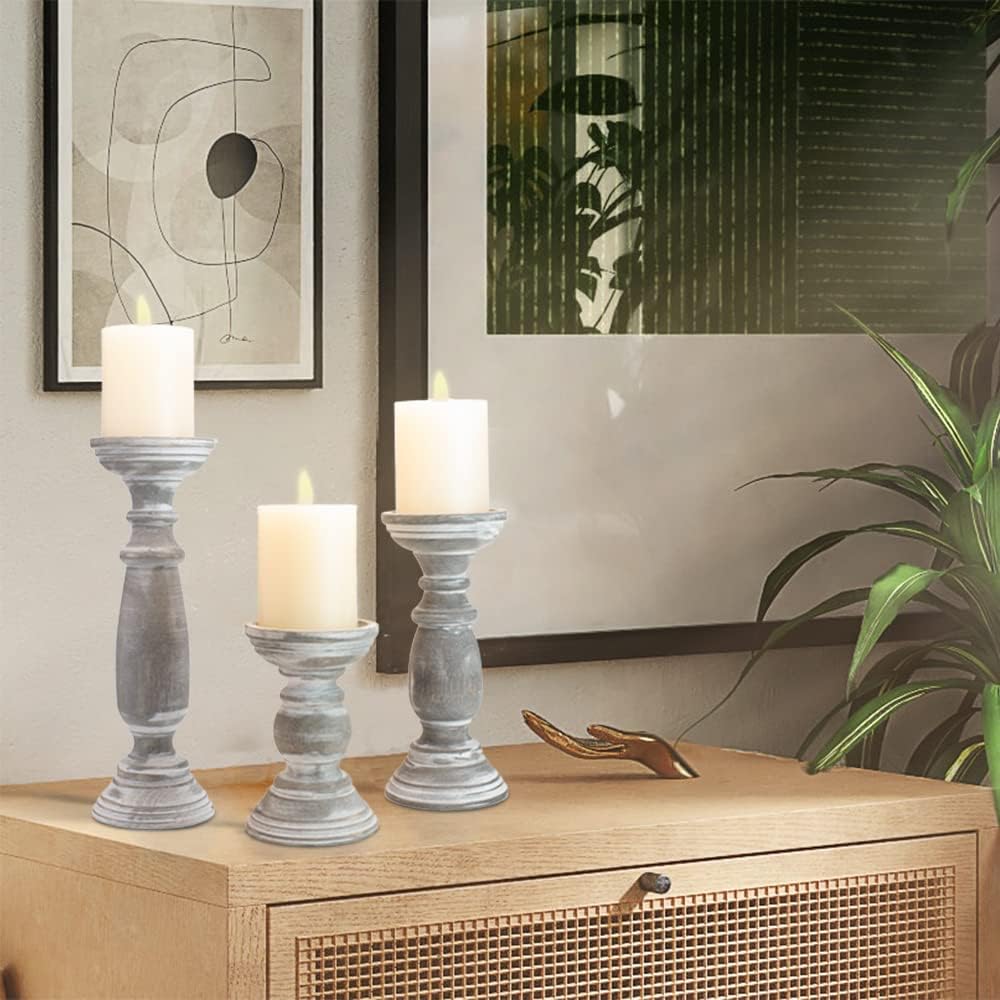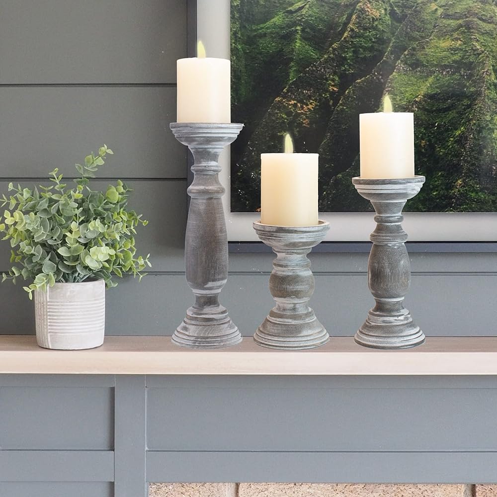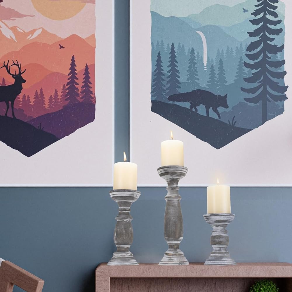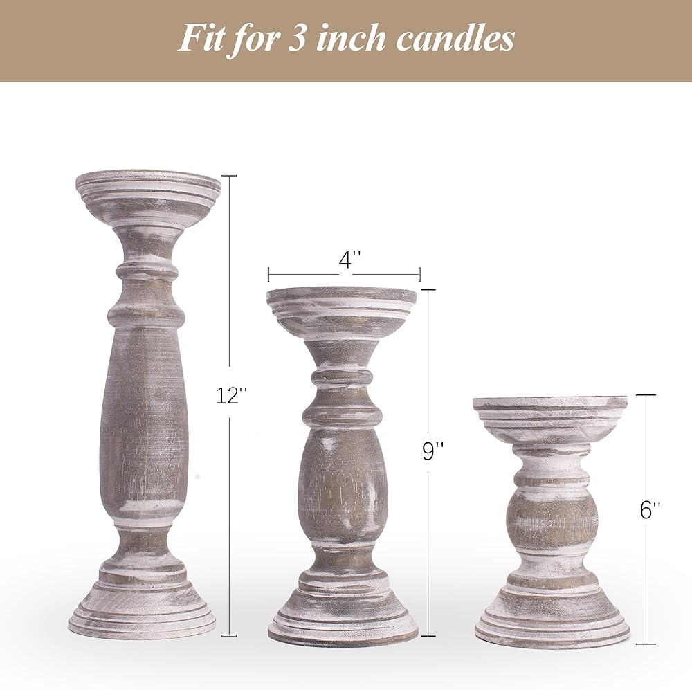 Dimensions: S:12”×4”M:9”×4” L:6”× 4”. wooden candlesticks are perfectly proportioned, featuring varying heights that create an aesthetically pleasing set. They are perfect wood centerpieces for tables, as well as decorative pieces for fireplace mantel decor, coffee table decor, dining table decor.