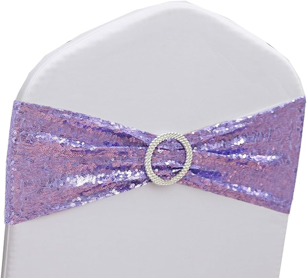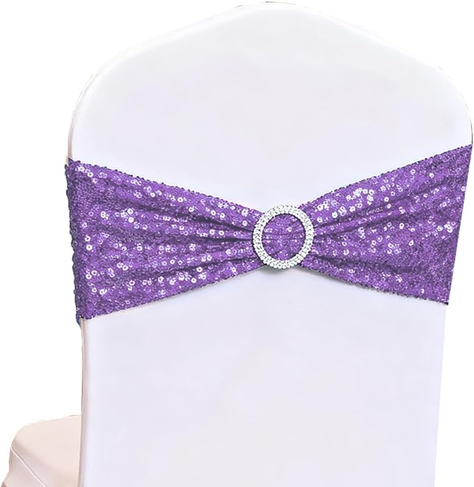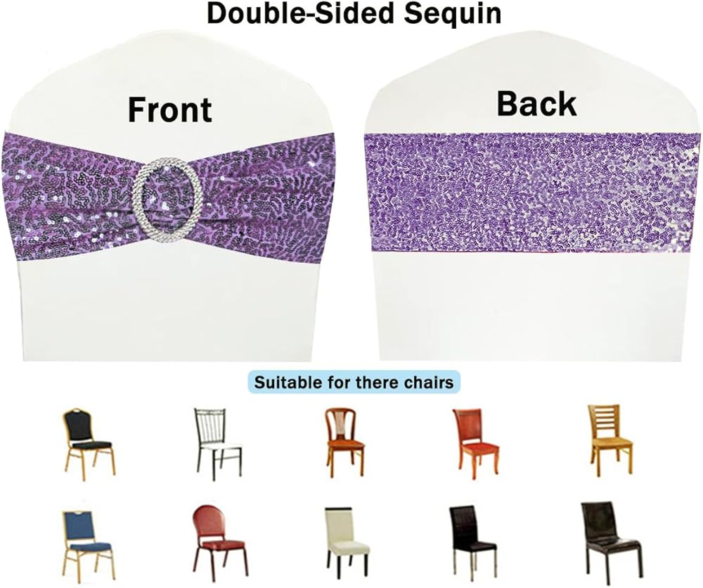 Sophisticated design: Both side is made of glitter sparkle stretch sequin fabric with sparkling round decorative buckle. That make the sequin chair sashes looks more shiny, which adds more romance and elegance to your weddings and parties.