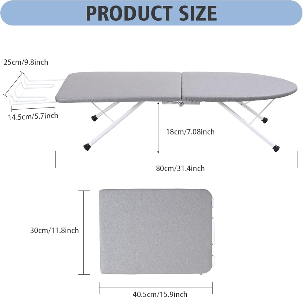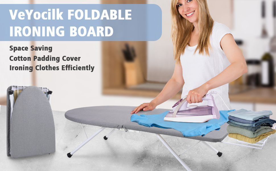 【Space-saving】VeYocilk folding table top ironing board fits into small places and allows to fold completely in half, the folded size is 15.9"L x 11.8"W x 2.8"H. Folding it casually will not damage it, and high-quality material to keep the lifespan of the unit for years. Easy to store and is the perfect size for limited spaces like dorms, or apartment. The open ironing board is 31.4"L x 9.8"W x 7.1"H.