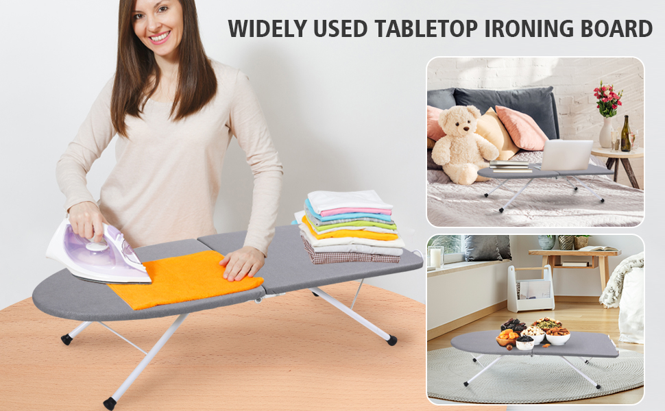 【Multiple Uses】The foldable ironing station is as functional as any other style. It can iron skirts, pants, shirts, very suitable for home, university or while traveling. Ideal for sewing, craft rooms or confined spaces. The portable tabletop iron board can also be used as a snack table or laptop desk on the bed.