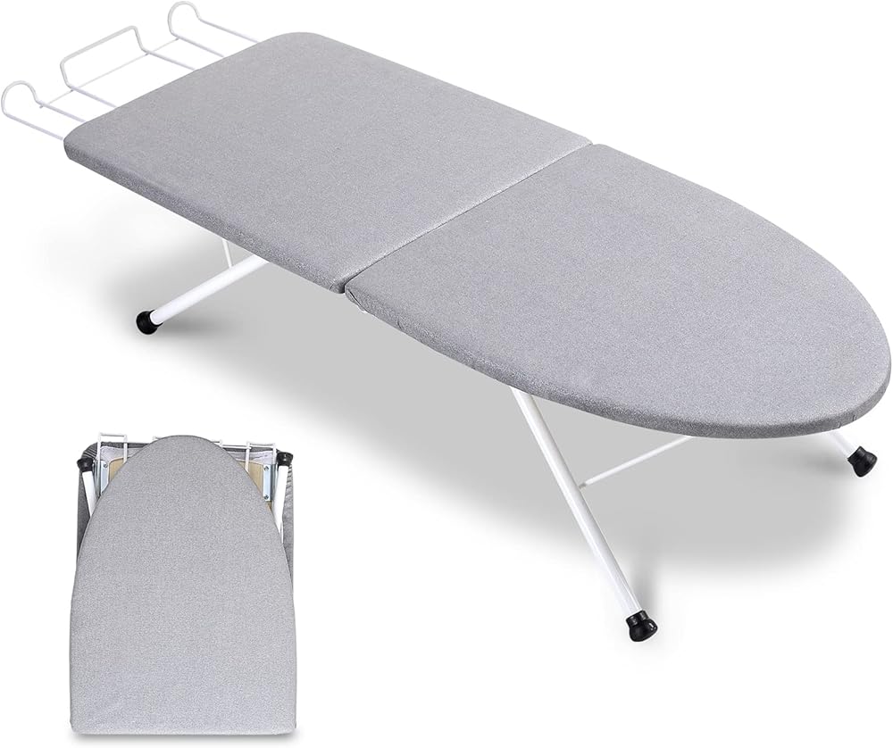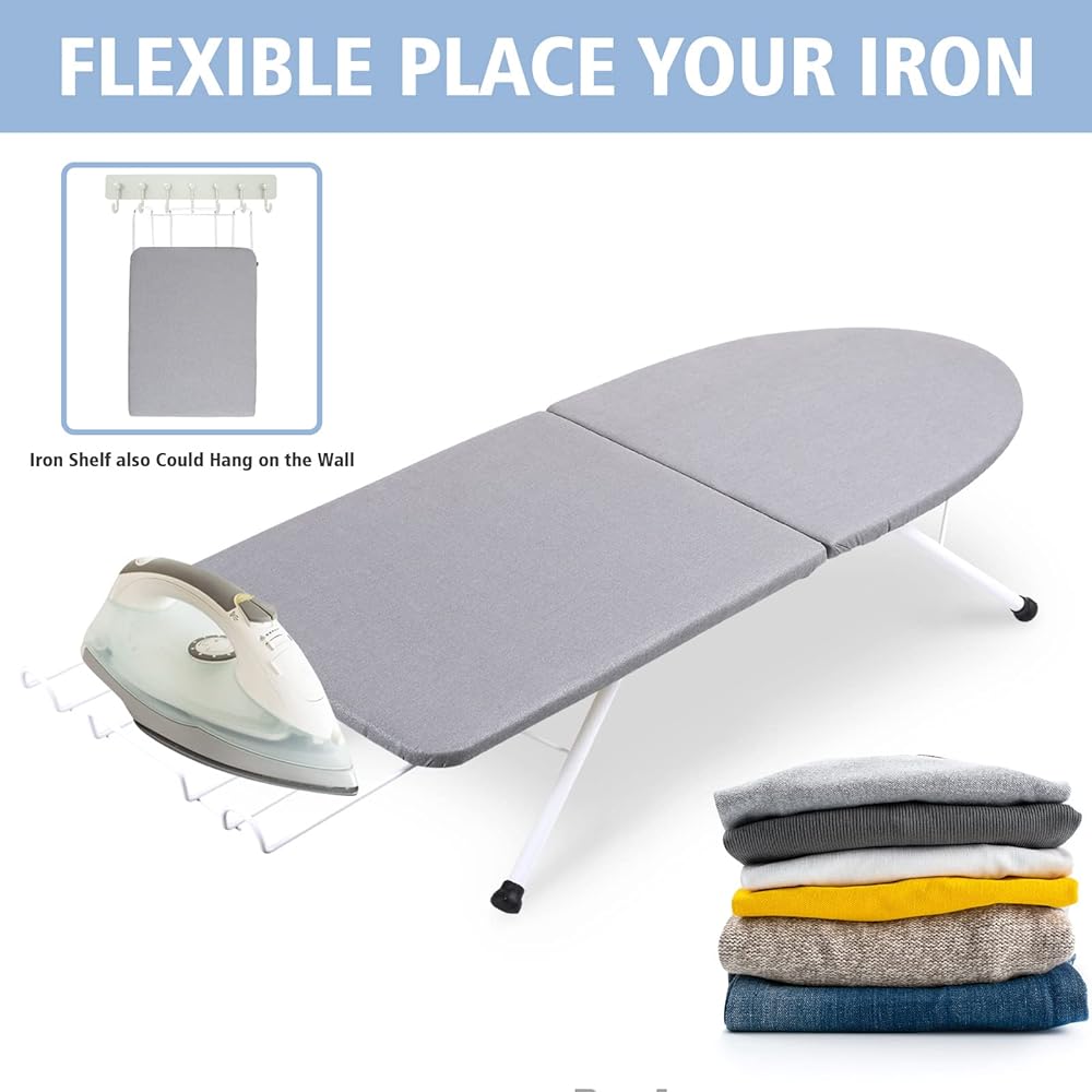 【Sturdy & Non-slip Feet】Reinforced folding steel legs are sturdy and durable. With the anti-slip adjustable silicone cap on the legs to help hold this small ironing board securely on glass, ceramic, laminate and wood surfaces, and protect countertops. You can rotate the cap and adjust the legs to keep the iron board stable enough.