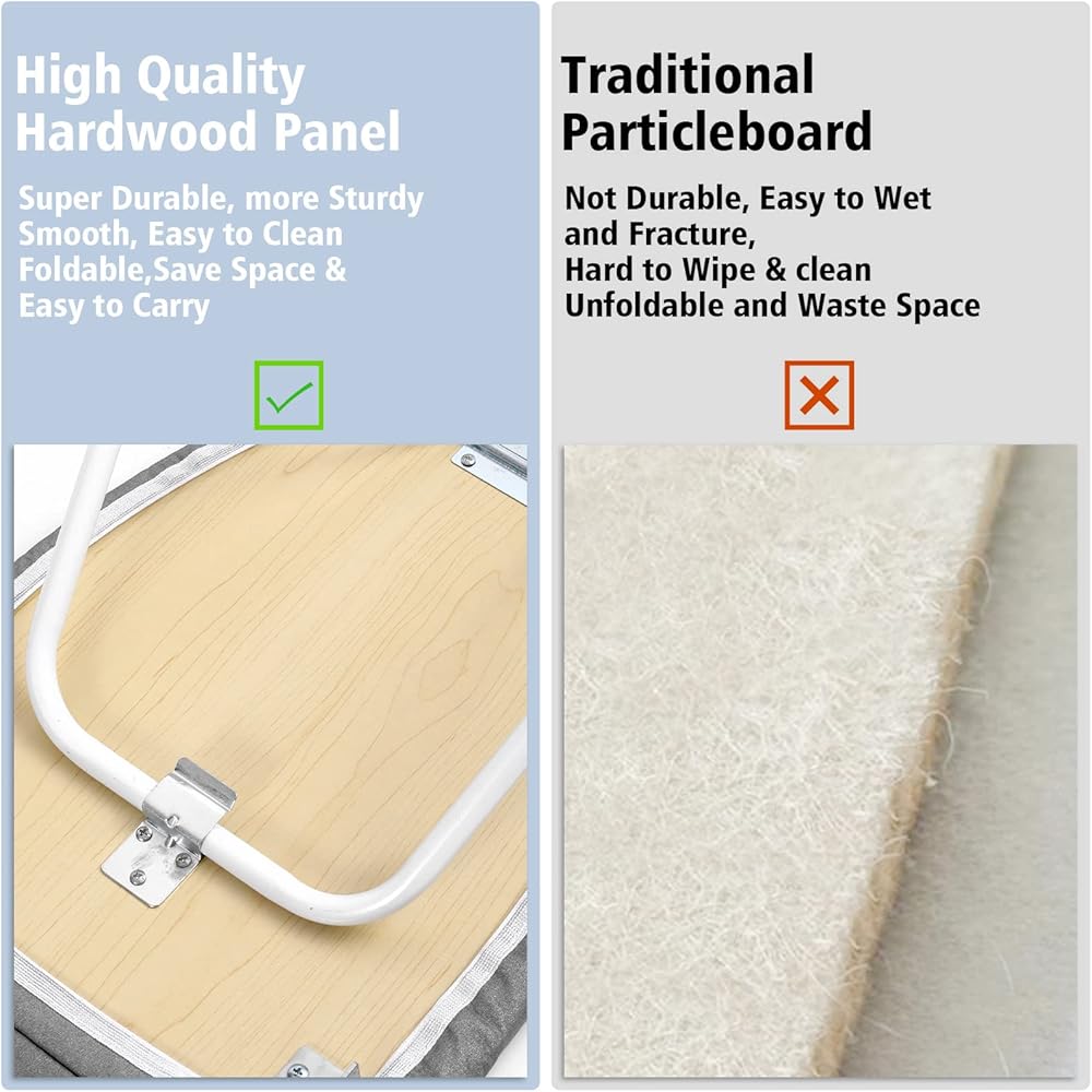 【Excellent Heat-resistance】The shirt folding ironing board is made of rugged tubular steel, and high-quality natural hardwood board. With heat-resistant thicken 100% cotton pad and soft smooth cover which provide good breathability, avoid damaging the ironing board and clothing. Better cover material for better ironing experience.