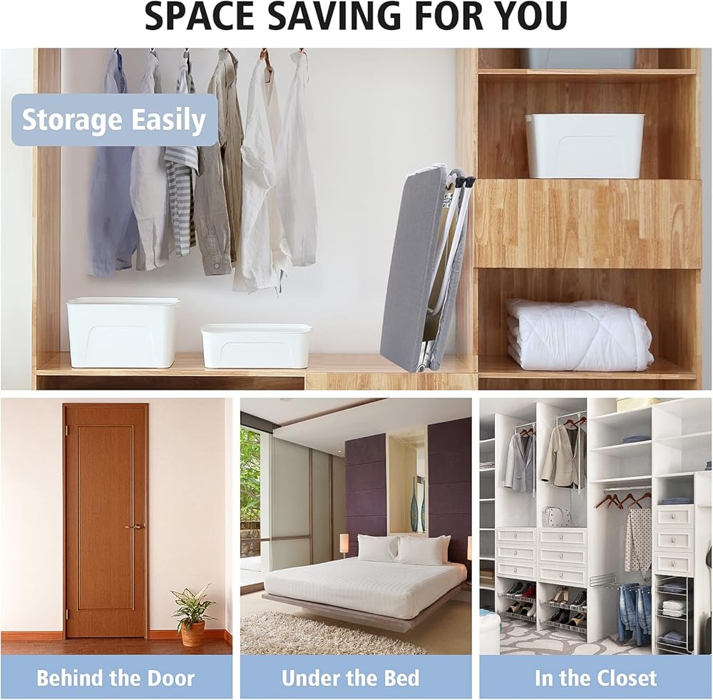 【Easy to Fold】Our compact ironing table adopts special locking method, easy to open and fold. The collapsible ironing board can be held in place by damped folding hinges when folded, it has perfect stability. With the iron rest can be used as a hook to hang on walls and doors, or store in narrow closets and drawers, easy to store.