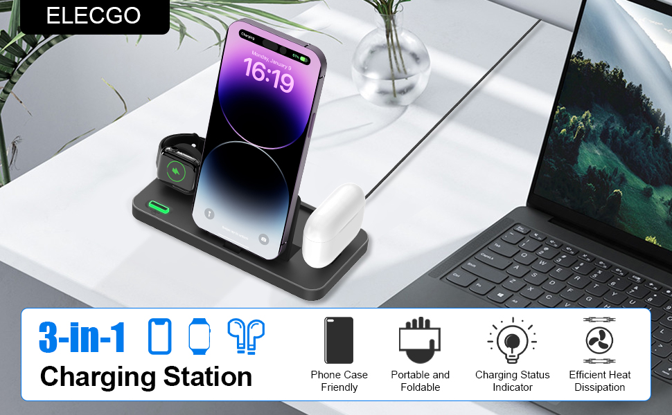 3 in 1 Foldable Charger Stand Dock, ELECGO Portable Fast Charging Station with Adapter, Compatible with iPhone 14/13/12/11/SE, AirPods 3/2/pro, Wireless Charging Dock for iWatch 7/6/5/SE/4/3/2