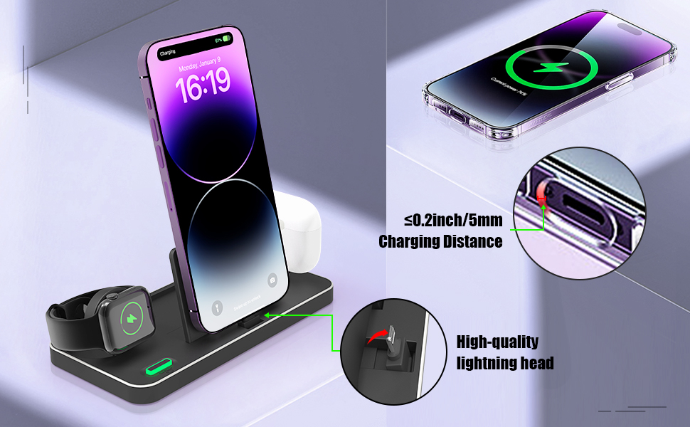 ⭐【Fully Upgraded and Design】The charging indicator on the charging station shows the charging status of the device, and it is also the button to eject the watch charging ring. The phone can be placed vertically for charging and chatting, and horizontally as a phone stand for watching movies. A new light switch button is added to turn off the light when you are charging at night to avoid blinding.