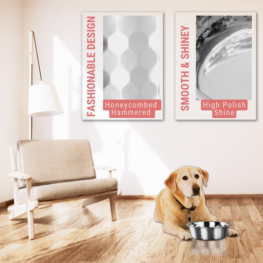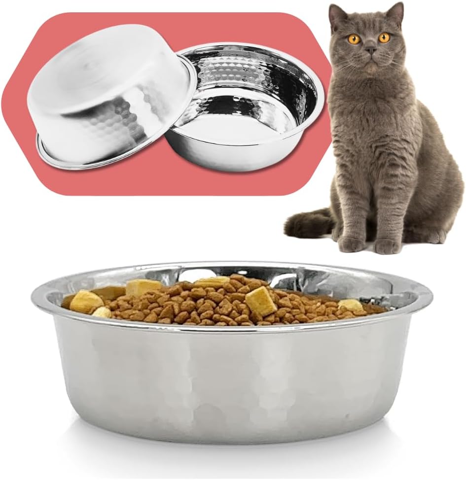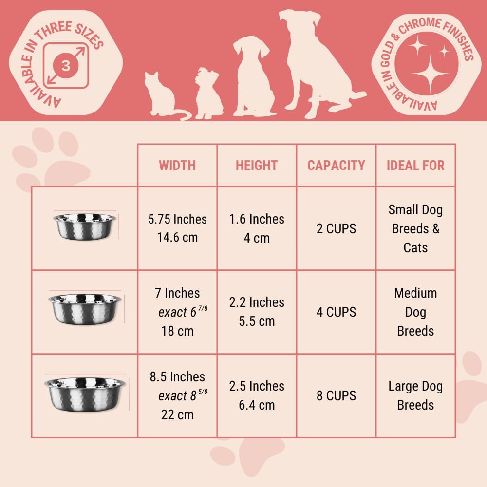 Introducing our Hammered Stainless Steel Pet Bowls – the perfect blend of style and functionality for your cats and dogs. Crafted from high-quality stainless steel, these bowls feature a unique hammered design that adds sophistication while providing a non-slip surface, preventing spills.The polished finish ensures a sleek look and easy cleaning, maintaining hygiene for your pets. Designed to withstand daily use, these bowls are durable and practical, making them an ideal choice for your furry friends.Available in gold and silver, these bowls cater to diverse preferences and complement any home decor. The gold option exudes luxury, while the silver option radiates a contemporary aesthetic. Choose the one that best suits your style and effortlessly integrates into your living space.Versatile enough to serve as both food and water bowls, these bowls accommodate the dietary needs of both dogs and cats. The shallow depth is perfect for cats, ensuring a comfortable eating experience, while the wide diameter provides ample space for dogs, making mealtime hassle-free.Upgrade your pet's dining experience with these Hammered Stainless Steel Pet Bowls. The high-quality construction makes them resistant to rust and corrosion, ensuring longevity. Say goodbye to mundane pet bowls and welcome a touch of luxury into your pet's life.Investing in these bowls is not just about style – it's a commitment to your pets' health and happiness. The hammered texture, polished finish, and sturdy construction make these bowls a perfect blend of form and function. Treat your pets to a dining experience they deserve with our Hammered Stainless Steel Pet Bowls – where elegance meets practicality. Upgrade their bowls, and in turn, elevate their dining moments to a whole new level. Your pets will thank you with wagging tails and purrs of contentment!