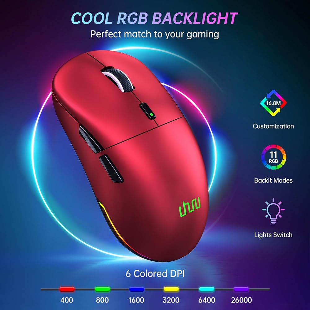 11 COOL RGB BACKLIT MODES: UHURU wireless gaming mouse features color wave effects customizable across -16.8 million colors. Install UHURU software to choose from preset colors and RGB backlight effects, It's perfect to match your setup, specific games, creating a more immersive gaming experience !